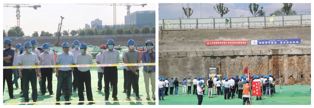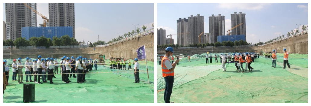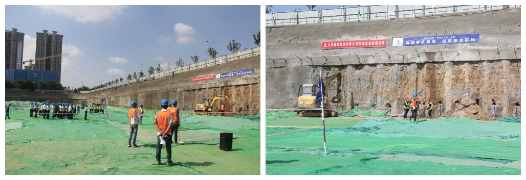 此次演练在恒大集团国际金融中心基坑支护项目进行,模拟演练项目支护体系因汛期暴雨导致坑边地下管线破裂渗水,引起基坑坑壁侧向位移超过报警值的险情情况发生,并发生抢险人员高处坠落事故。面对突发事故情况,集团公司迅速启动应急处置预案,立即开展应急救援行动。在现场总指挥的统一指挥下,事故抢险组、技术检测组、安全警戒组、医疗救护组、物资保障组、后勤保障组、应急联络组等共计30人赶赴事故现场进行救援工作演练。